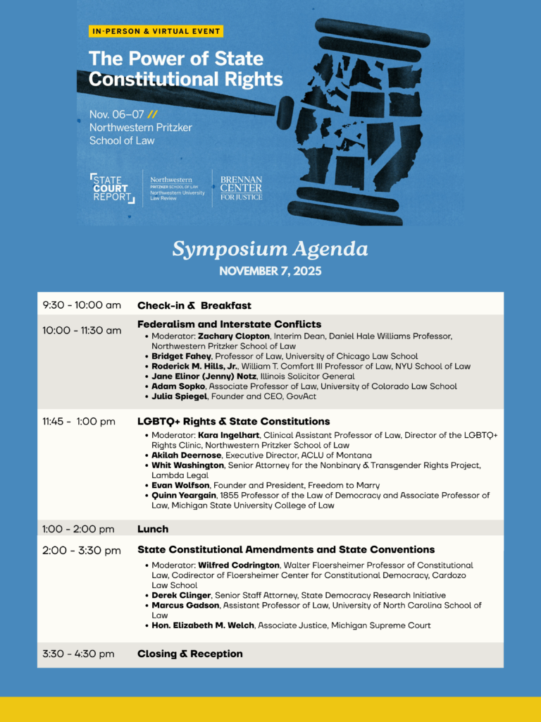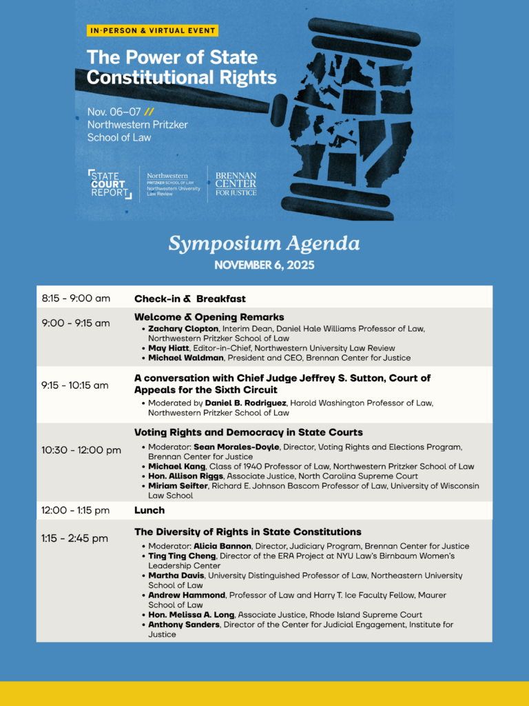 Northwestern University Law Review‘s fall 2025 symposium, The Power of State Constitutional Rights, was produced in partnership with The Brennan Center for Justice and State Court Report.